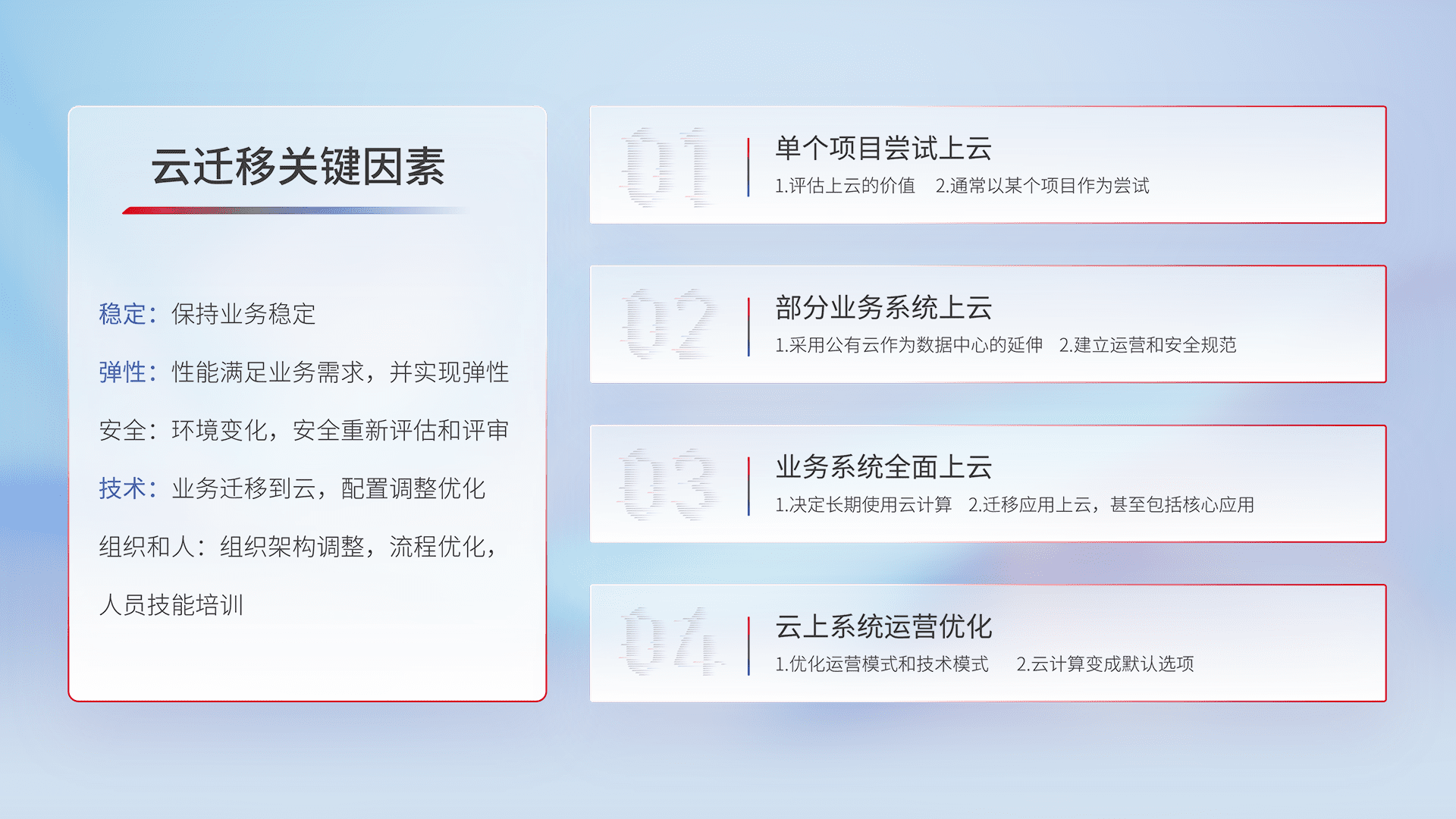 结合实际业务,,,,从规划设计、、云平台选型、、、云原生改造、、、数据迁移、、、集成交付,,迁移全过程为客户识别最佳上云路径,,,,做好风险识别管理,,,设计网络架构、、身份权限、、安全审计合规、、、、操作审计、、日志审计、、、监控告警策略、、、多站点容灾设计等,,,对云上基础设施进行整体规划,,,,提升IT治理水平,,,,以满足弹性、、高可用、、高性能的需求。。。