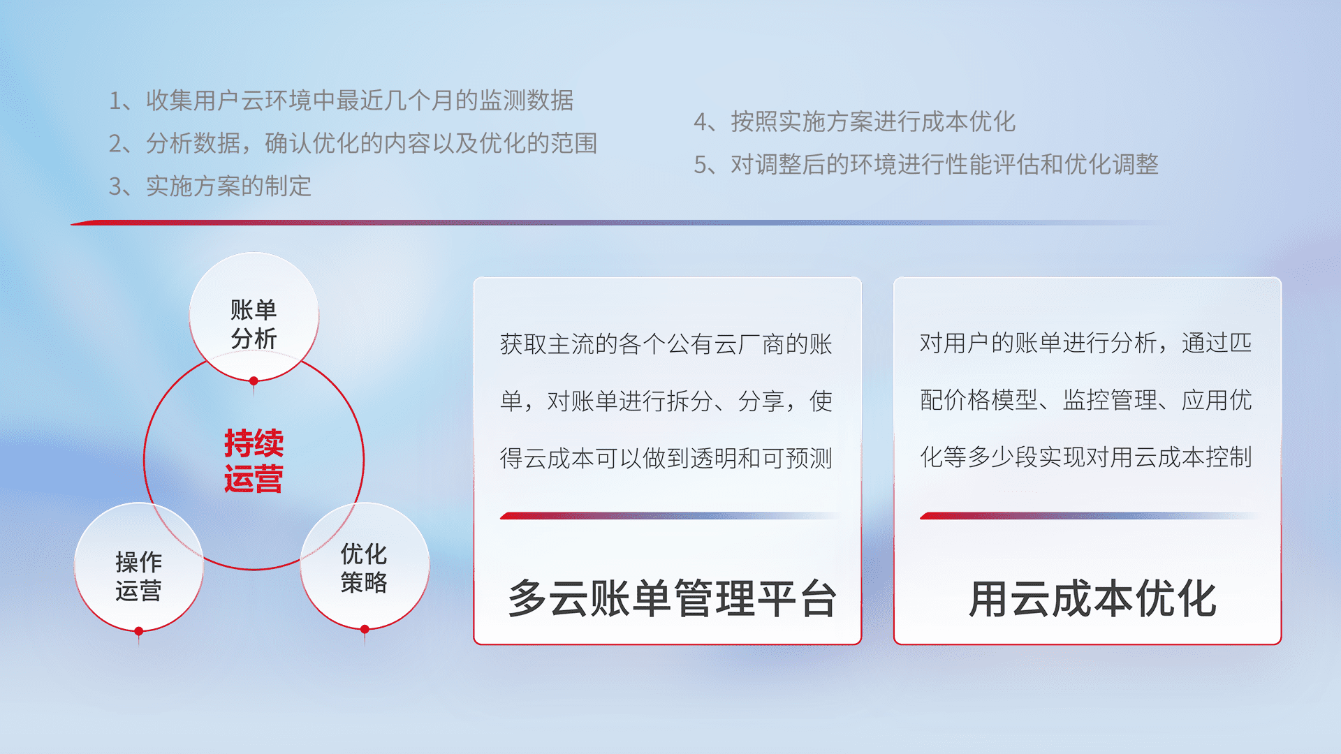 通过多云纳管,,以统一的资源数据模型把客户的云资源进行抽象和封装,,,进而实现对多云资源的统一操作,,,保障云资源管理的可靠性、、、稳定性与可用性。。量身定制化运维内容,,,,配置、、开发运维、、补丁管理、、、、备份、、、、监控、、认证和访问管理、、审计和日常巡检等,,,,保障在用云过程中的可靠度,,稳定度以及高可用率。。。。